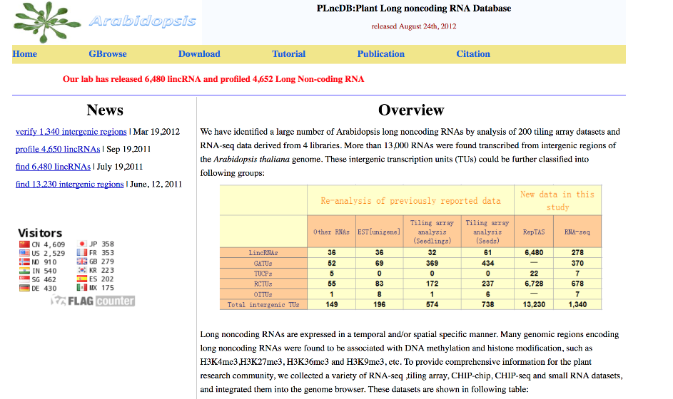 PLncDB(Plantlongnon-codingRNAdatabase)是现在公开发表的植物lncRNA专用数据库,也是现在较为全的植物lncRNA查询数据库。该数据库收集了EST分析、RepTAS分析、芯片、RNA-seq分析及TAIR中发现的16,227个拟南芥lncRNA的信息,记载了植物在不同组织、发育阶段、突变体和应激处理条件下这些lncRNA的表达特性,这个数据库的特点为:(1)从很多植物资源中收集到大量基因组中lncRNA的信息 (2)植物lncRNA的在线浏览及搜索平台 (3)多种样品的转录组信息融合,包括了不同组织,突变,环境胁迫,发育阶段等 (4)一系列表观修饰和小RNA数据 (5)下载浏览免费。
