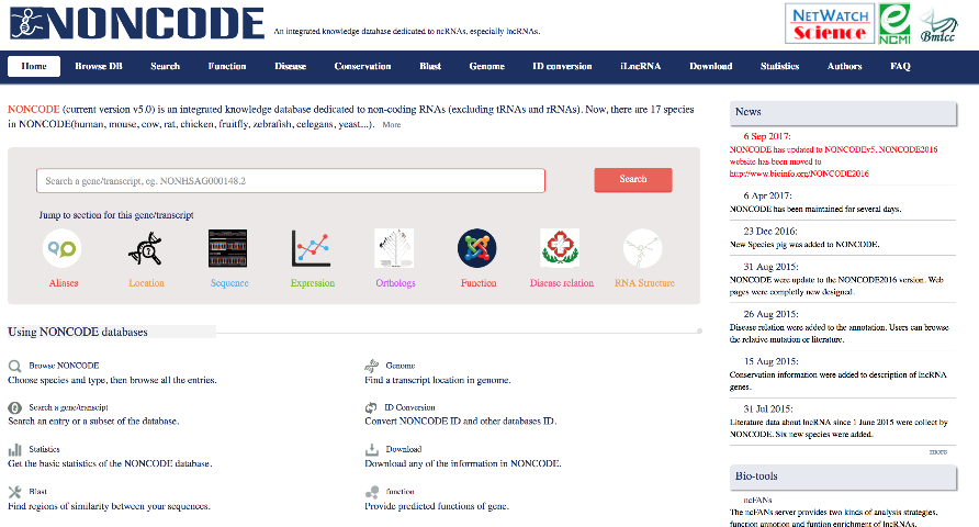 此数据库主要是详细记载了人和鼠相关的lncRNA,包括其序列,结构,功能,表达,保守型等。
