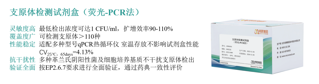 BJL(中国)基因支原体检测试剂盒(荧光-PCR法)依据《中国药典》2020版四部9201及《欧洲药典》9.0-2.6.7 Mycoplasmas相关要求开发并进行了全面验证,已完成与药典方法的一致性评价。探针序列基于生物信息学方法设计开发,具有支原体属内高度保守性及其他种属间高度特异性,在能检测110+种支原体的基础上保持对支原体检测的特异性,适用于细胞上清、血液、蛋白质样本等多类型生物制品中潜在支原体污染的定性或定量检测。